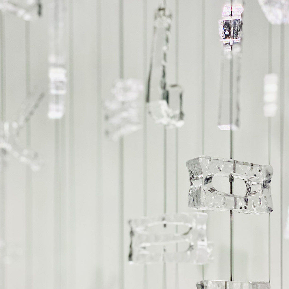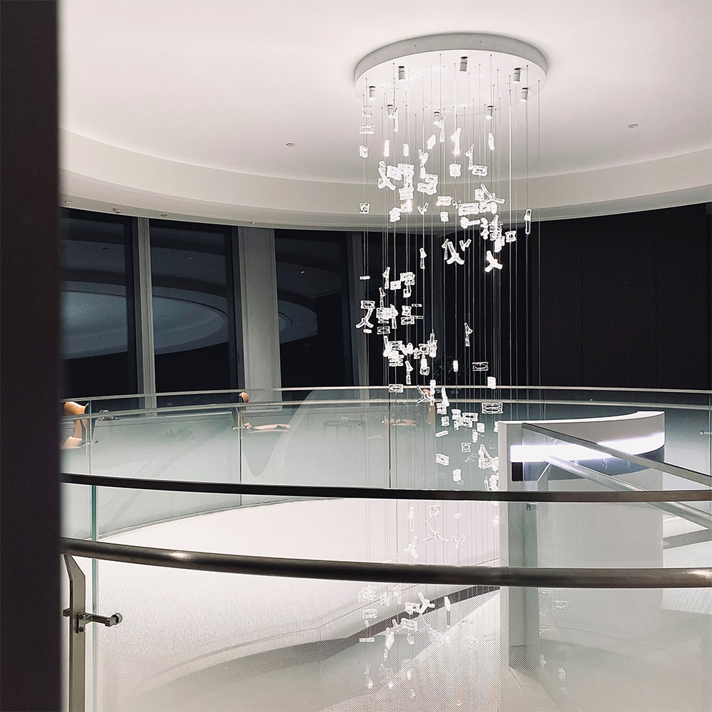表达:由中国汉字壁画解构而成的玻璃有韵律的垂吊,仿佛落入下方的“水池”中,泛起涟漪。下方的水池造型由汉白玉石材雕刻。