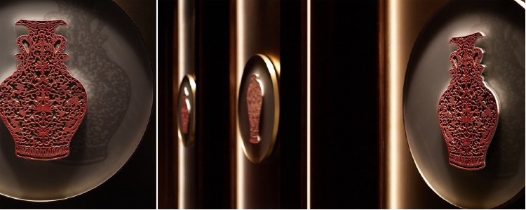 最近,我们与 SM Studio 和 GZ Art Co. 合作,为青岛钓鱼台酒店项目设计了一系列陶瓷艺术品,这件作品灵感来自中国传统剪纸。这些艺术品被摆放在酒店电梯走廊的显著位置。通过精心的画面设计及灯光照射,立体的陶瓷作品呈现出仿佛投影的效果,增添了更多层次感。